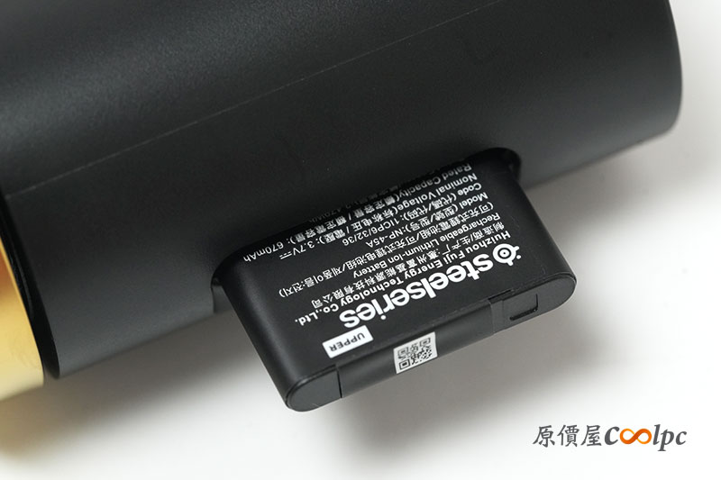 而另一邊則是電池的安裝位置。小編在這邊真的要拍拍手,雖然是磁吸式的設計,但是上蓋在吸回耳機上時,不會有位置不對的問題,一樣能維持 SS 金色 LOGO 擺正的狀態。這邊一樣能看出他們的用心!