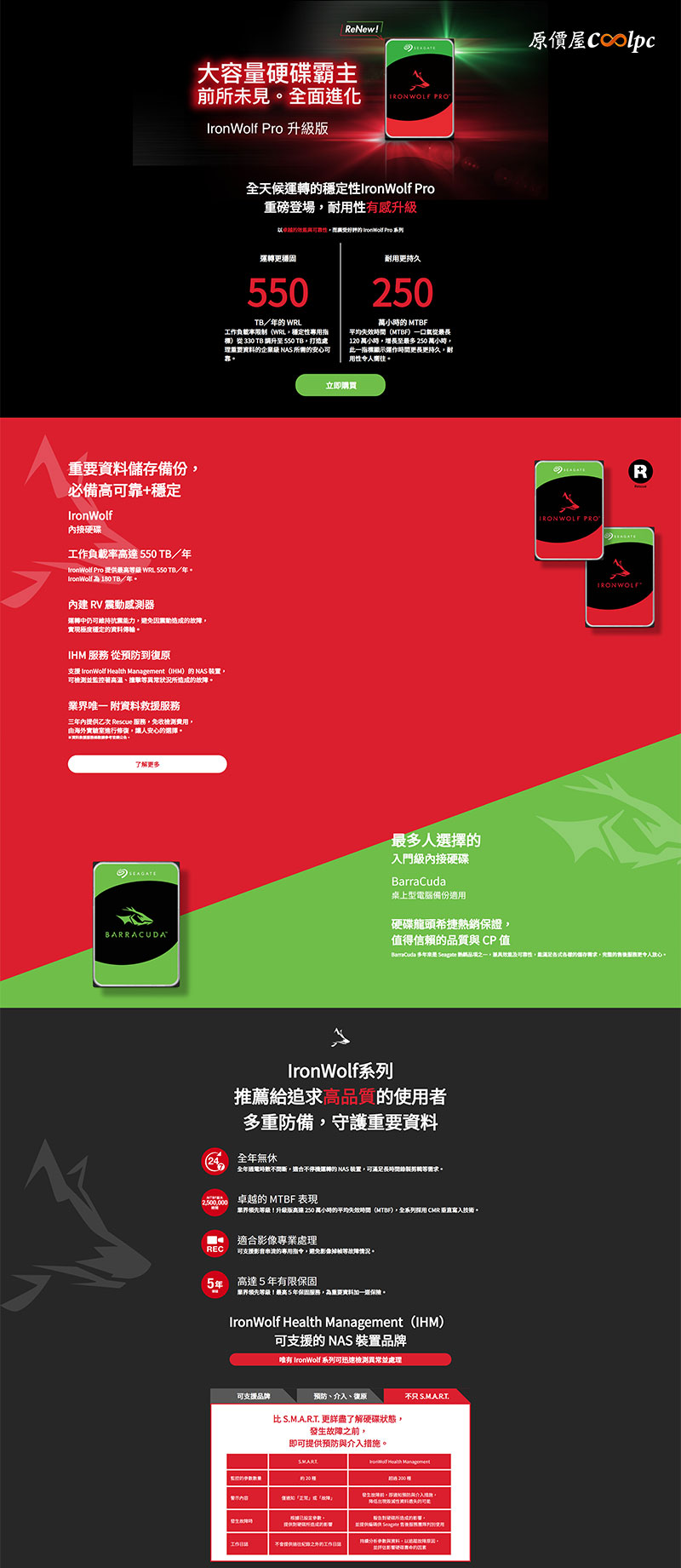 既然用作伺服器數據中心,硬碟的耐用度必須可靠穩定。希捷 IronWolf Pro 28TB/ 30TB 採用 CMR 技術和 AgileArray 技術(含雙平衡馬達、TLER、RV 感應器),確保 24 小時伺服器穩定運作,具備 512MB Cache、工作負載率(550TB/年)、250 萬小時平均故障間隔(MTBF)、7200 RPM 轉速及 275MB/s 最大傳輸速度,提供 IronWolf Health Management 硬碟監控,隨時掌握硬碟健康狀態!保固更是長達 5 年並享有 3 年 Rescue Data Recovery 服務(95%成功率)就是要你用得安心放心!歡迎有興趣的朋友可透過官網、門市諮詢或蝦皮商城輕鬆下單。