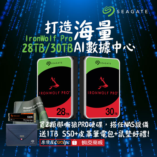打造 AI 數據中心靠 28TB/30TB SEAGATE 那嘶狼 Pro硬碟!買兩顆硬碟搭 NAS 再送 1TB SSD 與限量禮包。