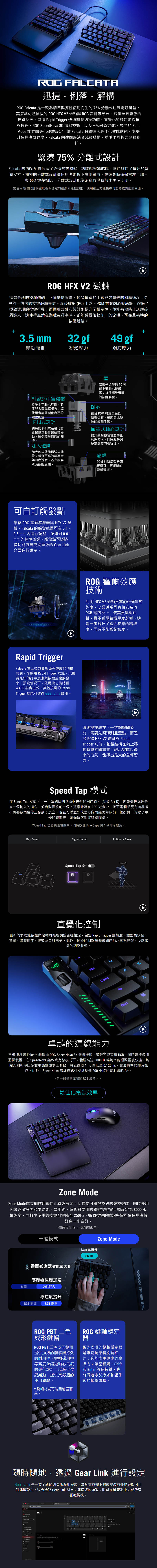 這把鍵盤最直觀的優勢就是「分離式」設計,你可以把鍵盤拆成兩半只留左半邊上場,當對手還在為了閃避而撞到鍵盤時,你已經騰出巨大的右手空間,滑鼠移動範圍大到不可思議!就算合再一起正常使用也僅有 75% 大小,維持了精巧的整體尺寸。規格方面搭載 ROG HFX V2 磁軸,觸發行程能在 0.1mm 到 3.5mm 之間自由定義,搭配 Rapid Trigger 快速觸發與 Speed Tap 模式,你的急停與走位都是即時反應!內部五層消音棉確保手感紮實不鬆散,再加上多功能旋鈕與燈效,這就是為了追求極致操作而生的裝備!上市初期我們也有撰寫過一篇開箱帶大家了解這把鍵盤的妙用(點我看開箱)感興趣的玩家們快趁這三天入手,用實力主宰戰局!