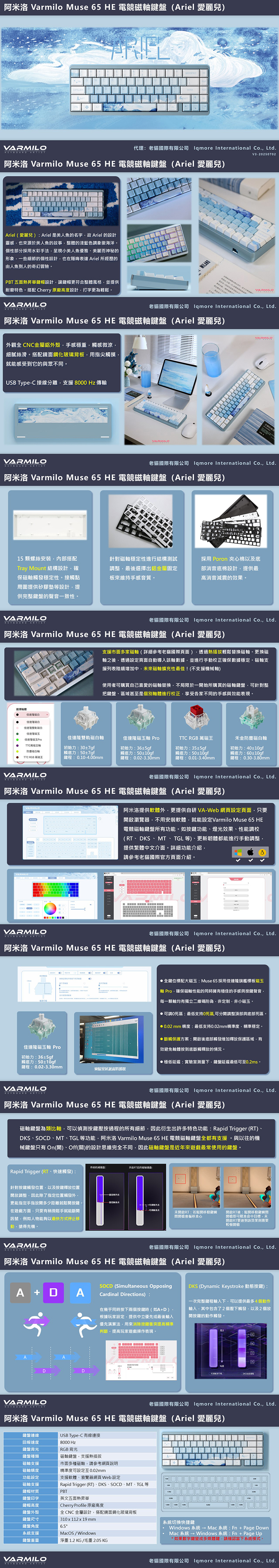 Varmilo Muse65 HE 電競磁軸鍵盤(愛麗兒)/有線/8000Hz/佳達隆磁玉軸 Pro/英文/熱插拔/Rgb/Ariel, $5190