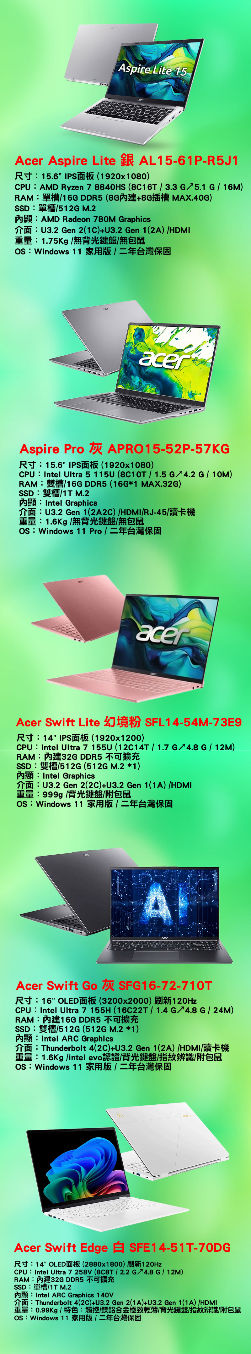 Acer 筆電延長保固專案僅適用 Aspire、Aspire 5、Aspire Lite、Aspire Pro、Swift Lite、Swift GO、Swift 14、Swift 16、Swift Air、Swift X、Swift Edge 系列機種,追求超高 CP 值,能穩定順暢搞定日常文書、視訊會議、休閒追劇的筆電可以挑 Aspire 系列,兩萬上下,好一點的三萬內搞定!如果你每天需要隨身攜帶筆電出門,主打極致輕薄、高顏值金屬機身 Swift 系列絕對首選,部分機型 OLED 面板,色彩更上一層樓,單價約三萬上下,最高階五萬多一點,處理器與記憶體就看使用需求挑選,總會有一台專屬於你。
