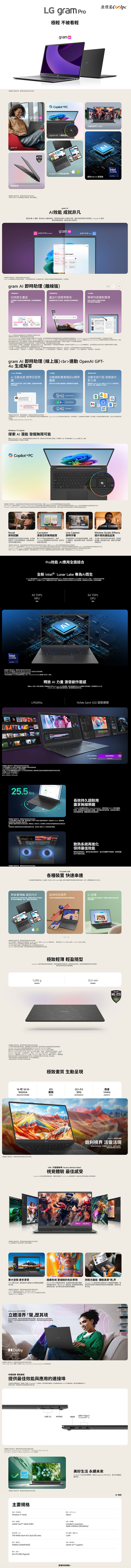 要找輕薄商用筆電,絕對不能錯過 LG Gram 系列,這次帶來 LG Gram 和 LG Gram Pro 16 吋兩款,以及 LG Gram 17 吋,總共三款筆電,前者兩台 16 吋重量差不多落在 1.2 公斤左右(PRO 1.24公斤),處理器皆採用 Intel Core Ultra 5 226V 8核(4P/4LP-E)8緒處理器,內顯晶片 Intel Arc 130V,具備 40 TOPS NPU AI 單元,讓筆電可以跑一些輕度 AI,像是視訊去背、追蹤、回顧(Recall)、即時字幕(Live Caption)等,內建 16GB DDR5-8533MHz 記憶體,因記憶體設計在 CPU 上,所以沒辦法擴充,硬碟的部分前者 LG Gram 搭載 512GB容量 SSD,後者 LG Gram Pro 則是 1TB,想要擴充的話還有一個插槽;LG Gram Pro 規格會比 LG Gram 好一點,像是 144Hz 更新率、雙風扇散熱系統、無 Micro-SD讀卡機,價格只差三千塊。而 17 吋的 LG Gram 規格就會比較高階一點,採用 Intel Core Ultra 7 155H 16核(6P/8E/2LP-E)22緒高效能處理器,內建 32GB DDR5-7467 MHz 記憶體(無法擴充),搭載 1TB(可擴充)。以上這三個型號皆搭載 77Wh 大容量電池,輕薄又有超長續航的筆電,無論是會議報告、即時創作、多工處理,都是商務與創意的最佳拍檔!且通過 MIL-STD-810H 7 項軍規耐久測試,完全是輕薄商務首選。