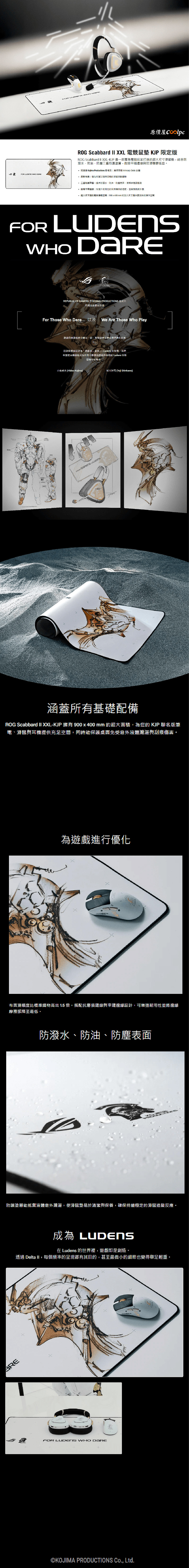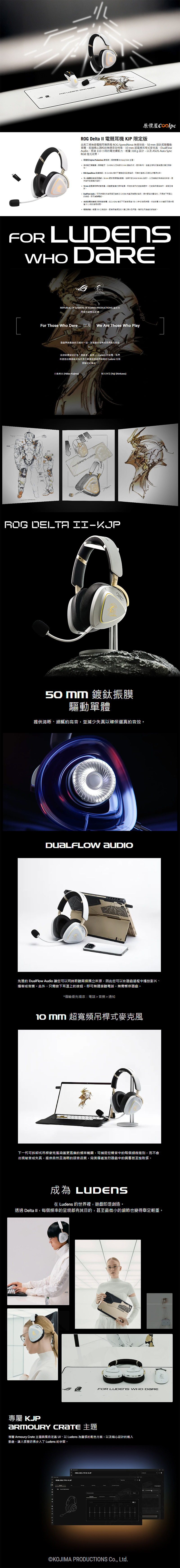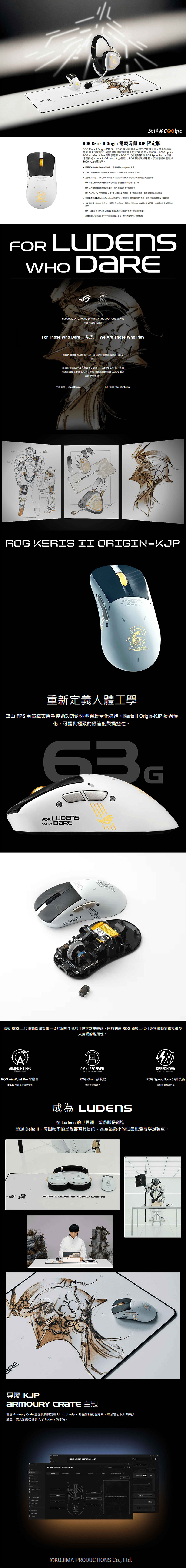 這回帶來的ROG x KJP聯名電競周邊有耳機、滑鼠、鼠墊,不僅有專屬的塗裝造型,搭配華碩Armoury Crate軟體使用也有專屬主題頁面,絕對有它的紀念價值,而且產品本身的性能也相當卓越!耳機是ROG Delta II-KJP,提供藍牙、2.4GHz及有線3.5mm三模連線方式,搭載ROG SpeedNova超低延遲無線連結技術,50mm鍍鈦振膜驅動單體帶來清晰細膩的逼真音效,還有範圍更廣的10mm超寬頻吊桿式麥克風,DualFlow Audio可同時連接雙裝置音訊,最長110小時的電池續航力,耳機318g極輕量設計配戴無負擔,外部還有支援ASUS Aura Sync的RGB燈光效果,售價是$8990元。滑鼠是ROG Keris II Origin-KJP,63g人體工學輕量設計,內建1億次點擊壽命的ROG 二代微動開關,42000 dpi ROG AimPoint Pro光學感應器,8000Hz輪詢率極低延遲,並選用ROG Paracord和100% PTFE滑鼠腳帶來滑順移動,還自帶3區RGB特效,售價$5490元。最後鼠墊是ROG Scabbard II-KJP,900 x 400mm超大尺寸提供寬裕滑動空間,柔軟布面搭配防水、防油、防塵三重防護塗層,耐磨平縫邊緣提升耐用性與舒適度,售價部分則是$1690元。目前正式在原價屋上架開賣啦,活動限量各40組售完為止,有興趣的朋友把握機會喔。