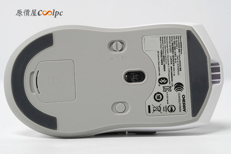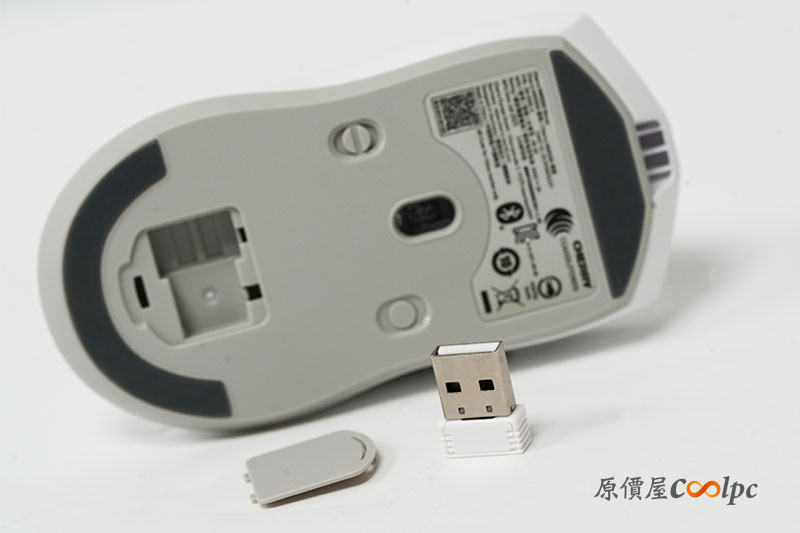 接下來是鼠底的部分。具備大面積的鼠腳貼與光學感應器 3950 Sensor,能提供 30,000 的 DPI,並且配置連接模式切換鍵與電源開關。