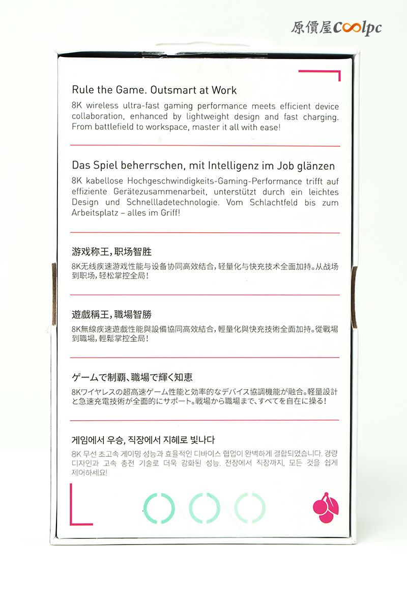 封底更有多國的文字說明,以精簡的一段話來形容「CHERRY 無線三模 MW5500 電競滑鼠」。
