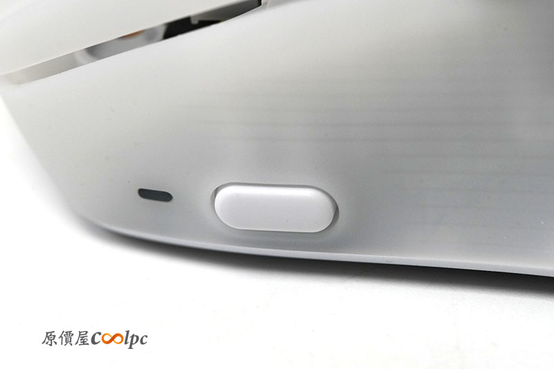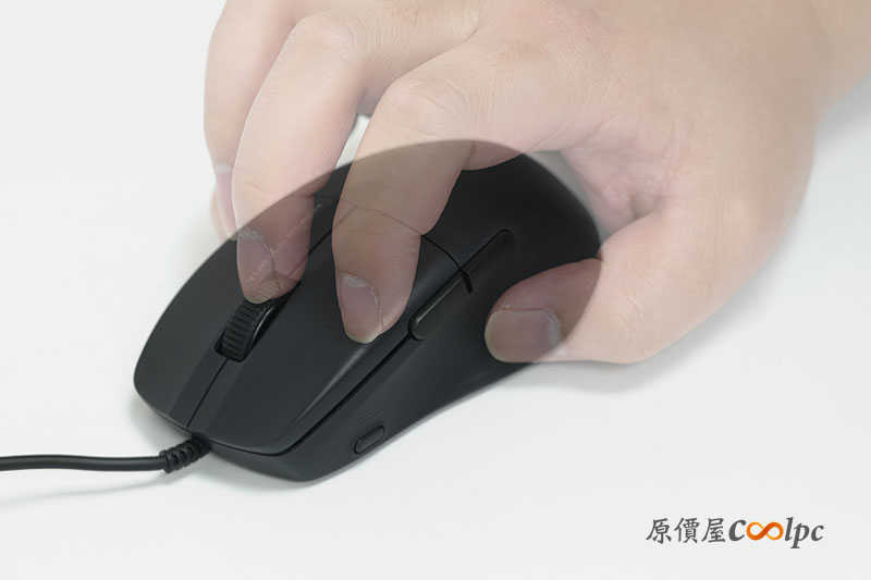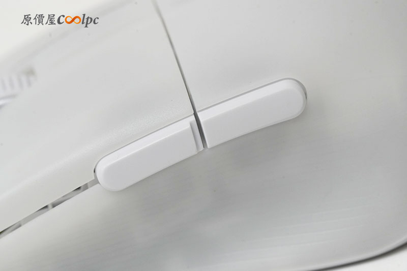 而滑鼠的 DPI 檔位調整,也是設計在滑鼠左側偏鼠頭的位置,這次相對少見的設計喔。