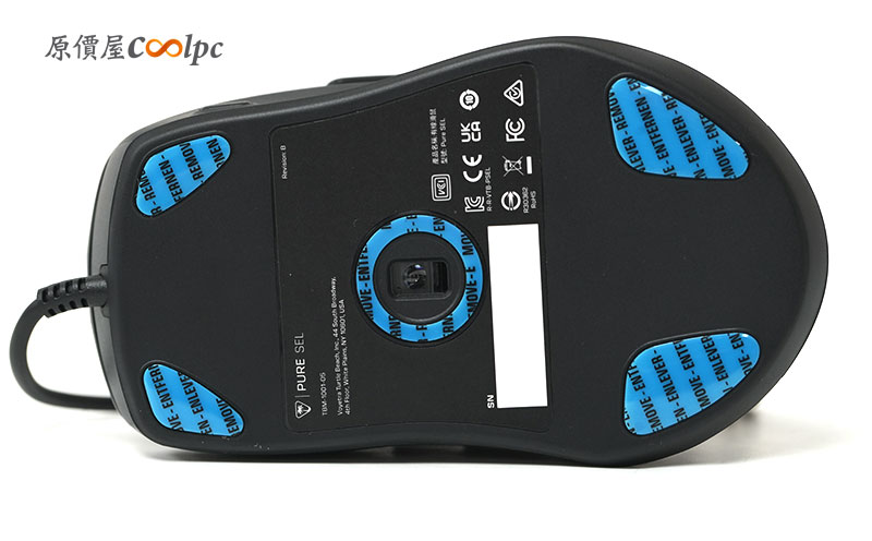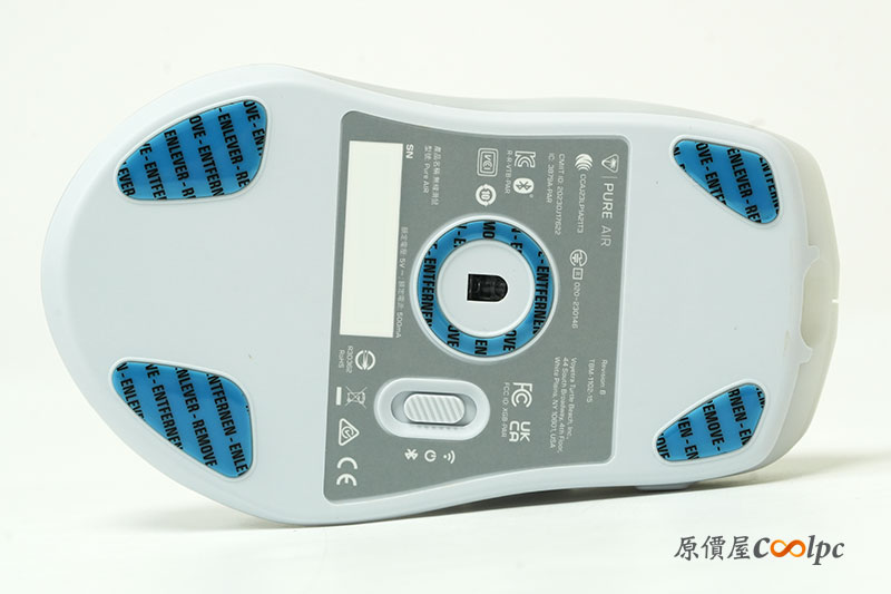 鼠底在四個角落都貼上了 PTFE 鼠腳。滑鼠的開關以及藍芽、2.4GHz 連線模式都以撥鍵形式來配置。