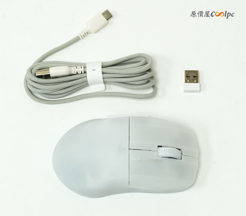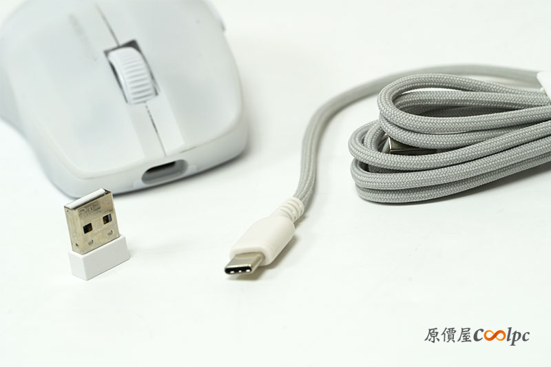 內容物全覽。除了滑鼠本體外,還有無線連接使用的 USB 接收器,以及充電用編織連接線。