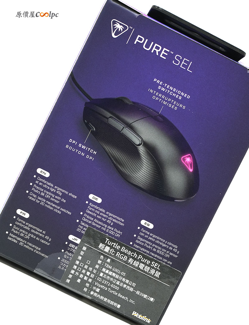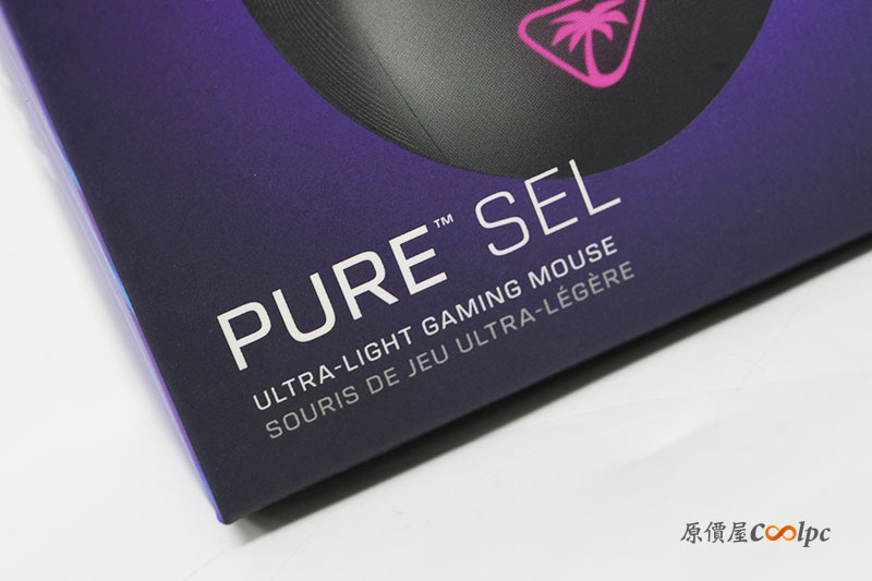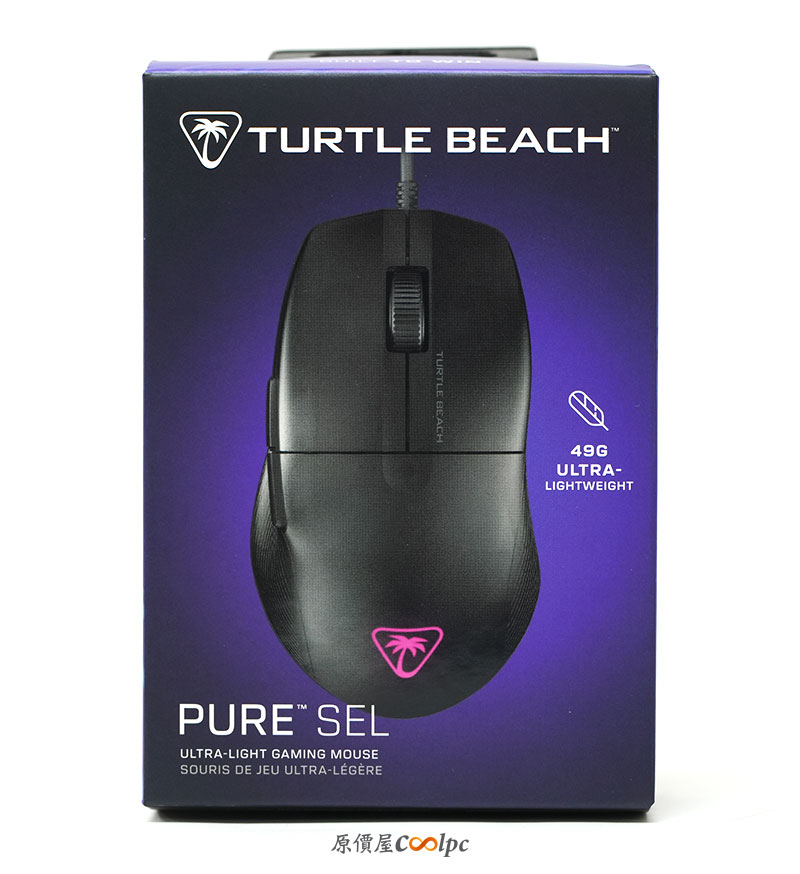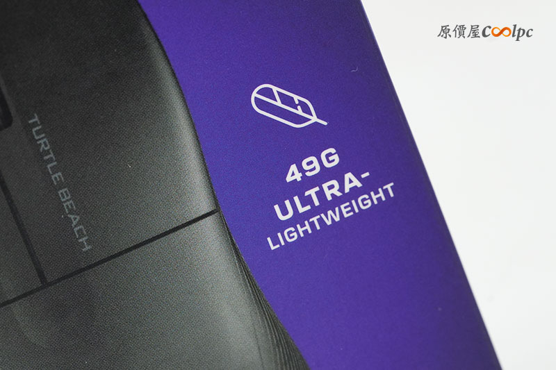 再來看看另一個型號「Turtle Beach PURE SEL」。包裝一樣使用電競藍紫色的視覺設計,上頭一樣有滑鼠的名稱、特色與規格。比較不同的是,「PURE SEL」在鼠身的重量上更輕了,僅 49g 誇張的重量,讓玩家長時間使用更沒有負擔!
