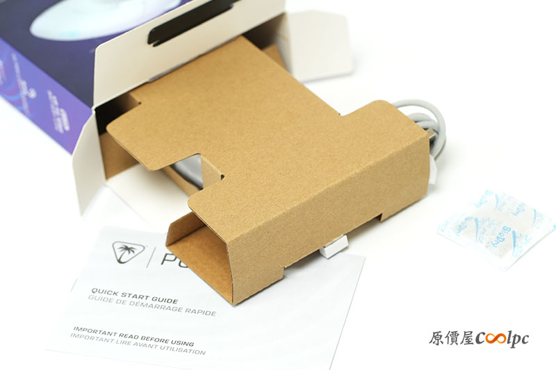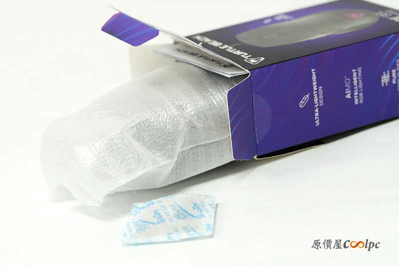 包裝內襯也不馬虎。使用環保厚紙板來固定保護滑鼠本體,另外還有說明手冊以及乾燥劑。