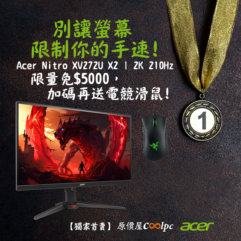 別讓螢幕限制你的手速!Acer Nitro XV272U X2 2K 210Hz 電競螢幕限量免五千,加碼再送電競滑鼠!