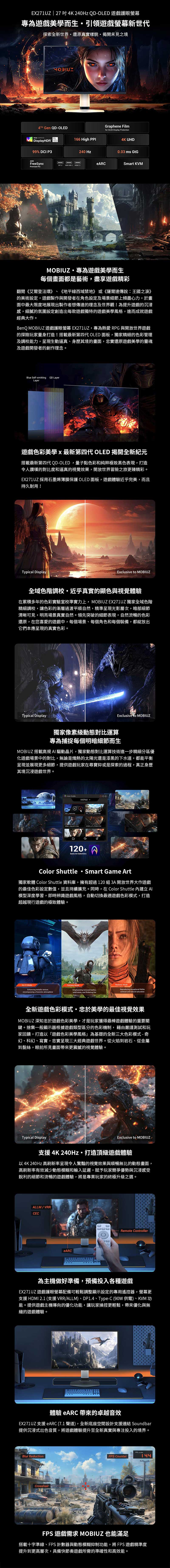 你以為 BenQ MOBIUZ EX271UZ 遊戲護眼螢幕就這樣嗎?不!MOBIUZ 搭載 AI 驅動晶片,且支援 Color Shuttle 軟體,擁有超過 120 組 AAA 大作專屬色彩配置文件(奇幻/科幻/寫實風格一鍵切換),讓 AI 應用、遊戲或 4K 後製從容應對;專屬 FPS 神器如十字準星、FPS 計數器、模糊抑制,搭配 FreeSync Premium Pro 抗撕裂,輕鬆解出勝利方程式。I/O 介面夠豐富:2 x HDMI 2.1(一組含 eARC)、DP 1.4、USB-C(PD 90W 快充 + DP Alt) + USB 5Gbps(2A1C),支援 KVM 多裝置切換,且附贈遙控器,透過 HDMI CEC 技術一遙控統御螢幕與次世代遊戲主機,結合 eARC 高品質音頻回傳 + ALLM 自動低延遲模式 + VRR 變頻率技術,為遊戲帶來極致沉浸感受!螢幕支架支援 100mm 高度升降,支援 VESA 壁掛安裝再加一分。細節把關也不含糊,螢幕皆經過出廠校色!白色機身更是娛樂場所、辦公環境的百搭首選!