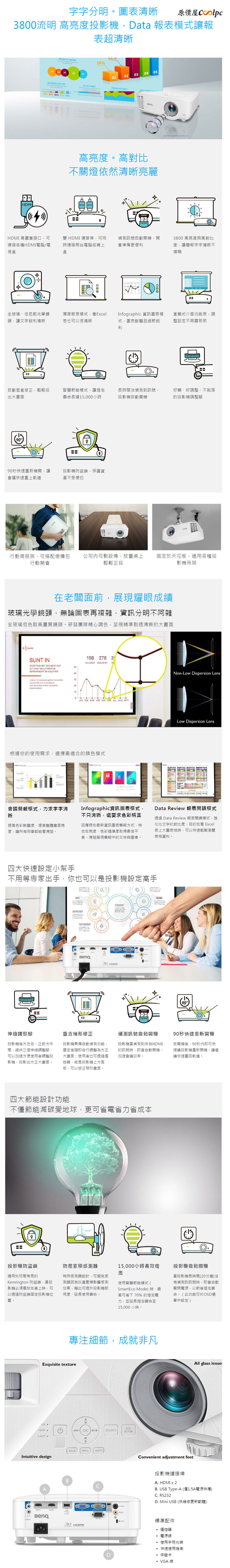 BenQ 商用投影推出 MH560 與 MX560 兩款高流明機種,讓你在日光燈下依然清晰可見,這兩台採用頂級全玻璃鏡頭,搭配 DLP 數位投影技術,精準呈現影像細節和色彩,具備 20,000:1 高對比度,讓表格線條與文字邊緣銳利分明。這兩台該怎麼選,追求極致亮度與 CP 值,首選 MX560,擁有 4000 ANSI 流明與 XGA 解析度(4:3),適合中小型會議室使用;若您的簡報包含精細報表或高畫質影片,可選 MH560,具備 3800 流明與 Full HD 1080p 解析度(16:9),細節呈現更完美。其他還有像是雙 HDMI 介面、SmartEco 節能模式、自動垂直梯形修正。