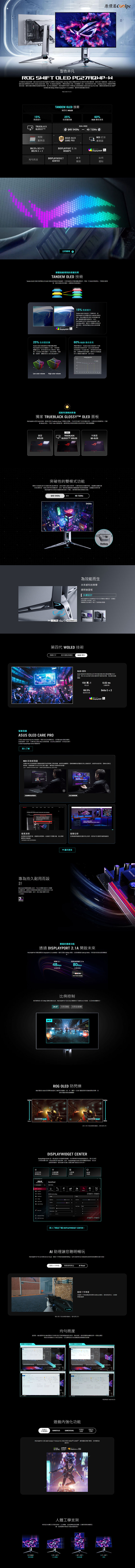 華碩 ROG Swift PG27AQWP-W 這台 OLED 螢幕是 FPS 玩家必備神兵利器!具備目前世界最快 540Hz@1440p 和 720Hz@720p 雙模式切換的電競螢幕,採用串聯式 OLED (Tandem OLED) 技術,與上一代 WOLED 面板相比,峰值亮度提高 15%,色彩量增加 25%,OLED 壽命延長 60%,結合獨家 TrueBlack Glossy 塗層,在明亮的環境下反射率降低高達 38%,黑色依然保持黑色,文字也更清晰,並且還有符合 VESA DisplayHDR 500 True Black 認證、99.5% DCI-P3 色域、真正的 10 位色彩和 Delta E<2 色差,整體的畫質表現更上一層樓。最浮誇的是螢幕外觀採用銀白配色,加上半透明的外殼,整體看起來更有科技感,不只讓你看清更是讓你看透!其他還有像是內建 NEO感應器,可精確偵測玩家與顯示器的距離。當你離開時,顯示器會轉換成黑色影像,當用戶返回時會立即恢復,以達到延長面板壽命的效果;搭載完整的 80Gbps 頻寬 DisplayPort 2.1A,滿足 540Hz@1440p 頻寬,不需要再透過 DSC 壓縮;還能透過 DisplayWidget Center 軟體,透過滑鼠就能調整螢幕的設定,無須透過實體按鈕來做切換;針對遊戲玩家還有提供動態十字準線、陰影增強、AI Visual 自動切換使用情境,搭配上不閃爍和抗藍光技術,降低眼睛疲勞不舒適感;還有符合人體工學支架,可提供上下 、傾斜、旋轉、樞軸調節,想要壁掛式安裝也不是問題,壁掛鎖孔VESA 100 x 100mm,螢幕保固給到三年,身為專業的 FPS 玩家!千萬別錯過啦。