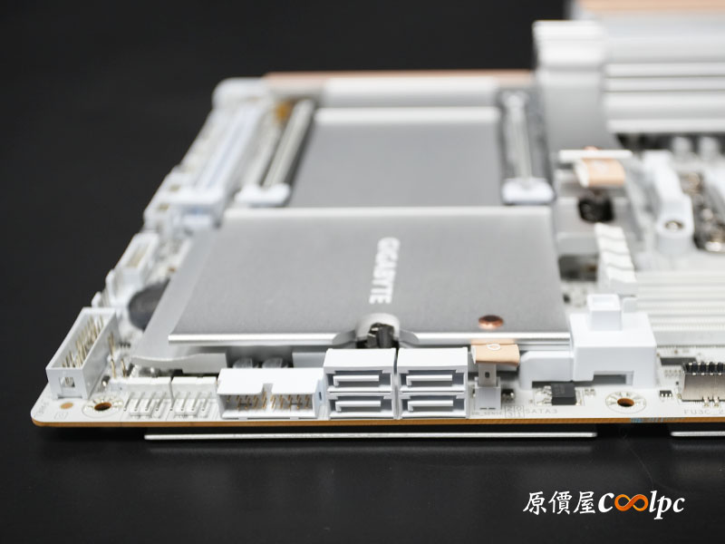 前置 I/O 共提供 HDMI、USB 20Gbps(Type-C)、 2 組 USB 10Gbps 擴充。同時可以看見 M.2 散熱片的末端都有一塊 AERO 皮革拉環,配合 M.2 EZ-Latch Click 與 M.2 EZ-Latch Plus 免螺絲快拆設計,不僅美觀,在 DIY 組裝上更省時省力。