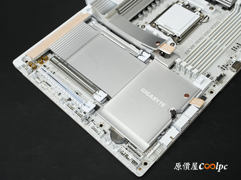 從這角度不僅可以更清楚觀察到 I/O 護罩的木紋飾板細節,還能看見圍繞著 AM5(LGA1718)插槽的大面積散熱裝甲,技嘉 X870E AERO X3D WOOD 採用 16+2+2 相數位供電設計,以及 8 層伺服器等級 PCB,強化信號完整性,Socket AM5 可支援 Ryzen 9000/8000/7000 處理器,即便搭載頂級的 Ryzen 9 9950X 或最新的 X3D 處理器,在高負載渲染或長時間運算下也能維持電壓的高度穩定。