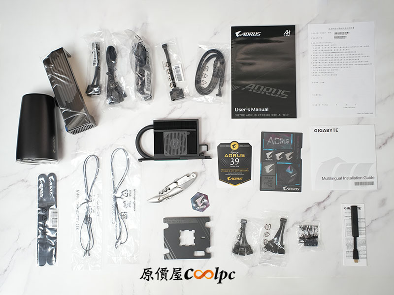 (點小圖放大)不愧是頂級旗艦的技嘉 X870E AORUS XTREME X3D AI TOP,光從配件的多元性就能略知一二。除了必備的說明書與 SATA 線材、Wi-Fi 7 天線,以及…