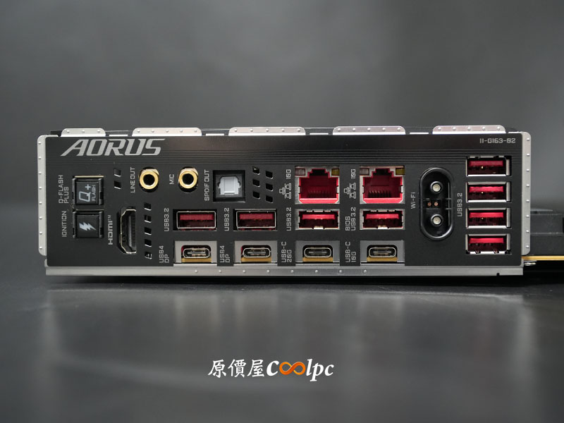 這 I/O 配置不僅高規又豐富,有雙 5G LAN、雙 USB4(40Gbps) 連接埠(DP輸出功能視 CPU 而定),還有 USB 20Gbps(Type-C)、數個 USB 10Gbps 介面、Wi-Fi EZ-Plug 快拆天線。同時整合多個實體功能按鍵(Power、Reset、Q-FLASH PLUS、CLEAR CMOS)。