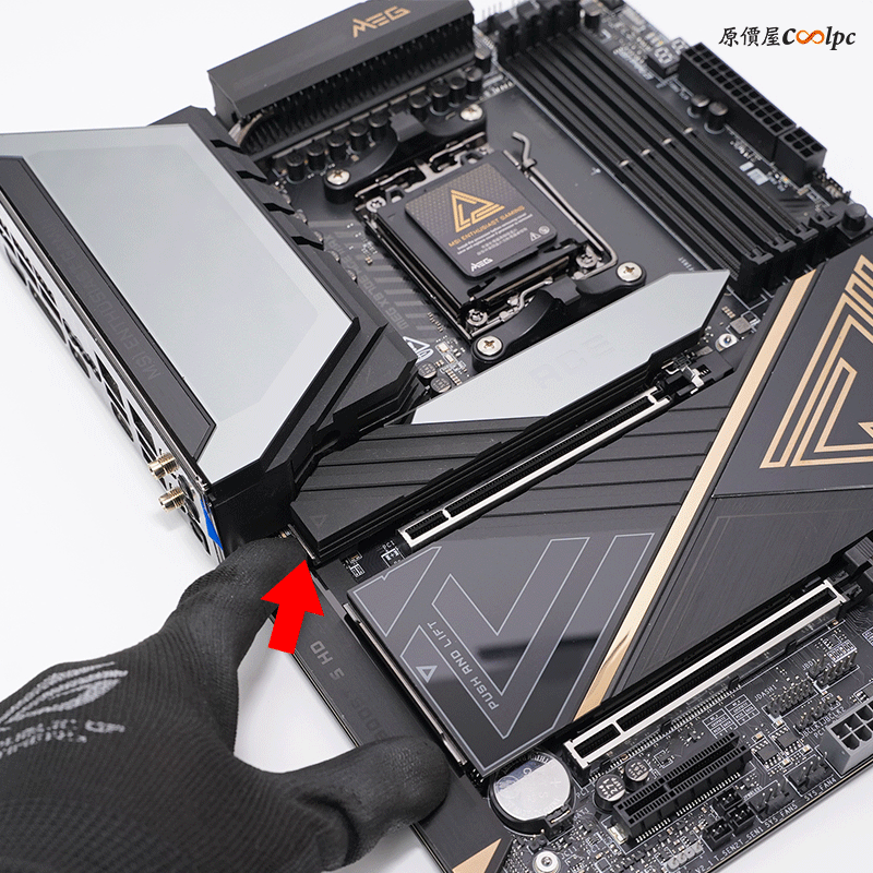 M.2 散熱裝甲一樣也有免螺絲快拆設計,按壓左邊的開關往上抬,就能將散熱片拿起來