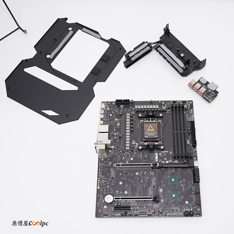 I/O 出廠已經安裝好後擋板,介面也是給的相當多樣豐富!有 HDMI 2.1、9 個 USB3.2 Gen2(10Gbps) Type-A、2 個 USB-C(40Gbps)、2 個 USB-C(10Gbps)、Flash BIOS、Clear CMOS、Smart 按鈕、10GbE、5GbE、Wi-Fi 7、S/PDIF OUT、3.5mm MIC IN、3.5mm L OUT。