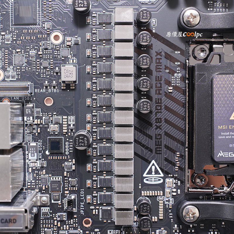 (點圖放大) 緊接著來看看主機板內部用料囉!拆開波浪式鰭片與直觸式交叉熱導管 散熱模組,後 I/O USB 介面採用模組化設計,主機板採 18(110A)+2+1 數位供電相數設計,電供主控晶片為 Renesas Electronics RAA229620,MOSFET 為 R2209004 SPS 和一顆 AOZ5516QI 與 RT3672EE 主控,HDMI 中繼晶片 Realtek RTD2151,USB4 晶片 ASM4242,USB4 提供 PD 充電晶片 IT8857FN,Type-C 晶片正反兩顆 ASM1543,10GbE 有線網路晶片 Marvell AQC113,5GbE 有線網路晶片 Realtek RTL8126,PCIe 5.0 訊號中繼晶片 Phison PS7101,音效晶片 Realtek ALC4082 Codec 和 ES9219Q DAC,雙 AMD X870E 晶片,環控晶片 NCT6687D,WI-Fi 7 + 藍芽 5.3 傳輸晶片為 MTK MT 7927。