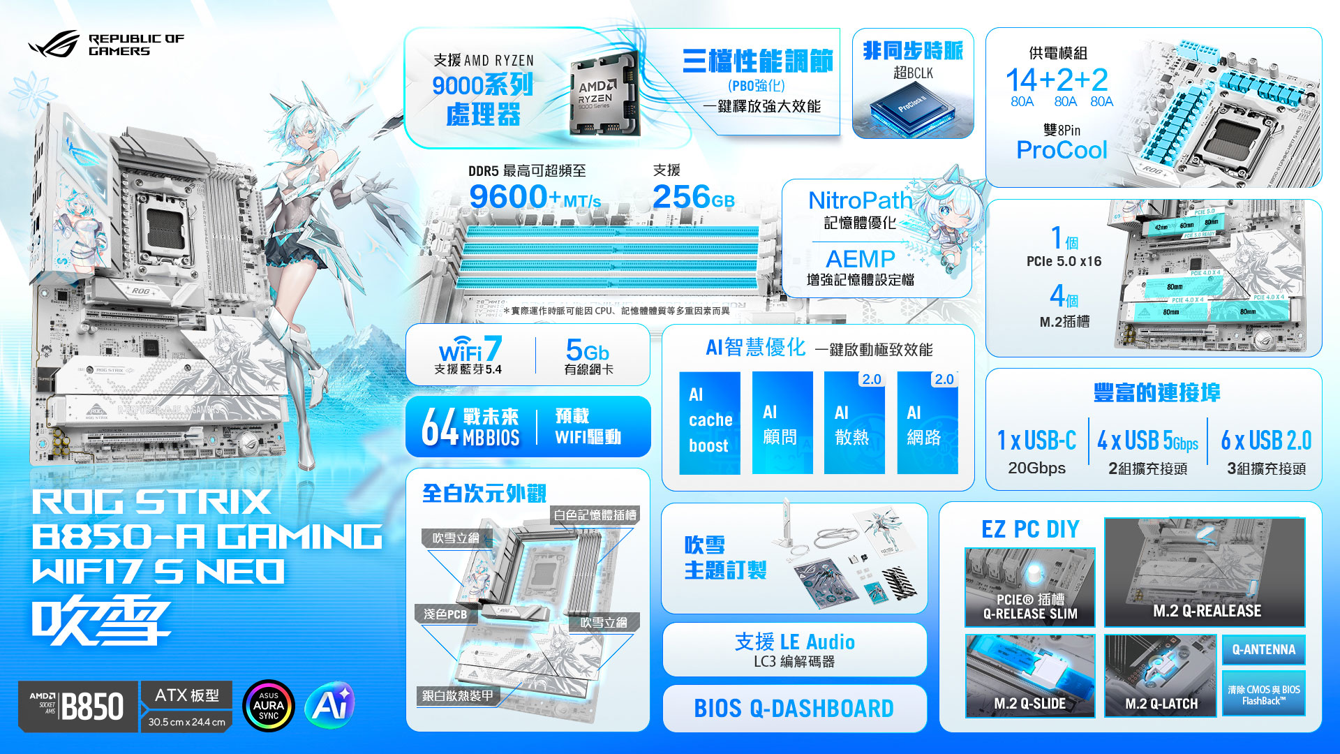 華碩 ROG STRIX B850-A GAMING WIFI7 S NEO(吹雪)(ATX/LAN5G+Wi-Fi 7/註五年)14+2+2相,$8,490