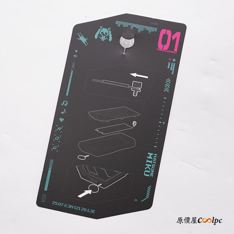 內部配件整齊排列,充滿初音未來的細節設計,展現出製作方的誠意。配件包括收藏小卡、初音未來專用退片針、以蒼綠色為代表色的保護套以及 R 型掛鉤,甚至連使用說明書亦改版為初音未來主題,極具吸引力。