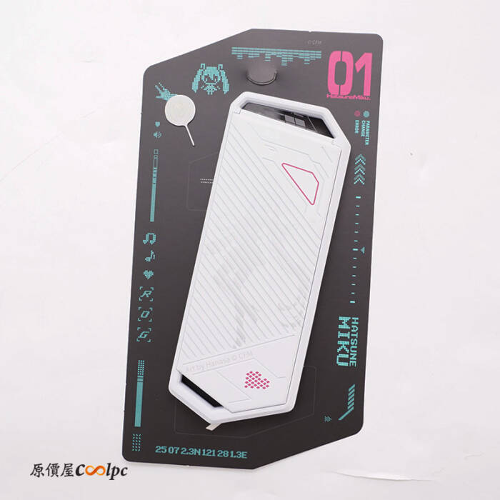 外盒上清晰可見 MIKU 醬圖像。M.2 SSD 外接盒的完整型號為「ROG STRIX ARION HATSUNE MIKU EDITION」,外觀融入初音未來的特色元素,但功能與 ROG STRIX ARION 系列完全相同。