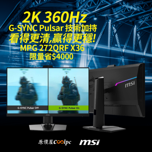 NVIDIA G-SYNC Pulsar 黑科技加持,讓你看得更清贏的更穩!MSI MPG 272QRF X36 2K 360Hz 電競螢幕限量優惠,登錄再送遊戲一套!