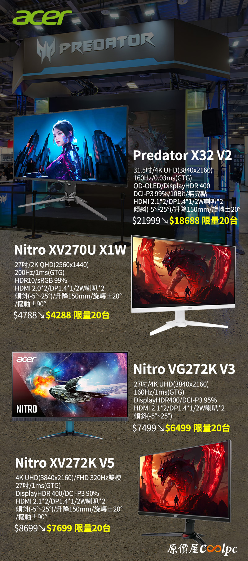 對手的一舉一動你都清楚洞悉,ACER電競螢幕就是允許你這麼做,趕緊來一趟2025 WirForce現場,保證你的視野都不同了!今年原價屋特別進駐WirForce會場,同時帶來一系列優惠活動,有會場限定促銷、每日限量排隊商品、全台門市活動價等等, 這回的ACER電競螢幕促銷就是只有在WirForce現場才有,像是搭載頂級QD-OLED面板、4K 165Hz的ACER Predator X32 V2,現在到活動現場直接便宜三千元!另一台ACER Nitro XV272K V5可以在4K 160Hz/ FHD 320Hz間雙模切換,高解析與高刷新一次滿足,這台也折了一千元!還有一台4K 160Hz的ACER Nitro VG272K V3也是現折千元。最後是ACER Nitro XV270U X1w,雖然只有2K 200Hz相對小一點,不過是採用高質感的白色機身設計,同時還有小降五百元的優惠喔。上面四款都是在WirForce現場限量販售,數量各20台售完為止喔!