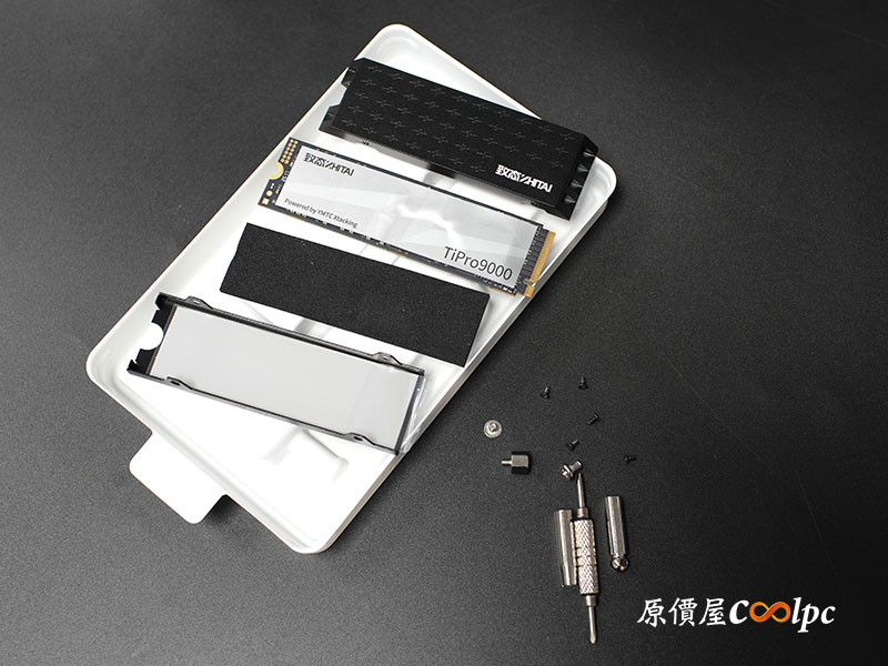 內容物共有致態 ZhiTai TiPro9000 2TB SSD、散熱模組、螺絲起子、螺絲包、說明書。
