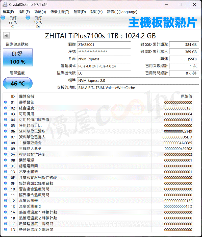 首先測試無輔助散熱的溫度表現,以 CrystalDiskMark 進行性能測試,在 CrystalDiskInfo 資訊得知待機溫度為 38°C,高效能運作溫度最高達到 71°C。