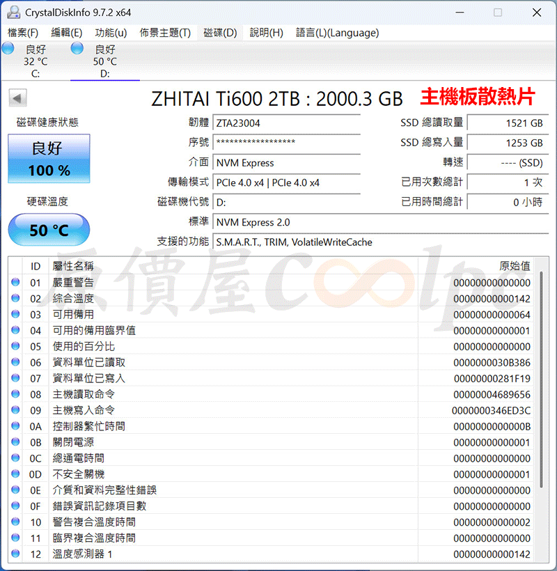 使用 CrystalDiskInfo 軟體,沒有安裝主機板散熱片下,待機溫度是 55 度,滿載寫入高達 70 度,如果主機板沒有散熱裝甲的話,建議購買一個散熱裝置,才不會因溫度而降低讀寫效率。