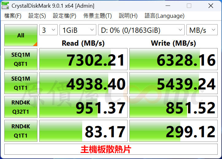 CrystalDiskMark 連續讀寫速度高達 7302.21/6328.16 MB/s。