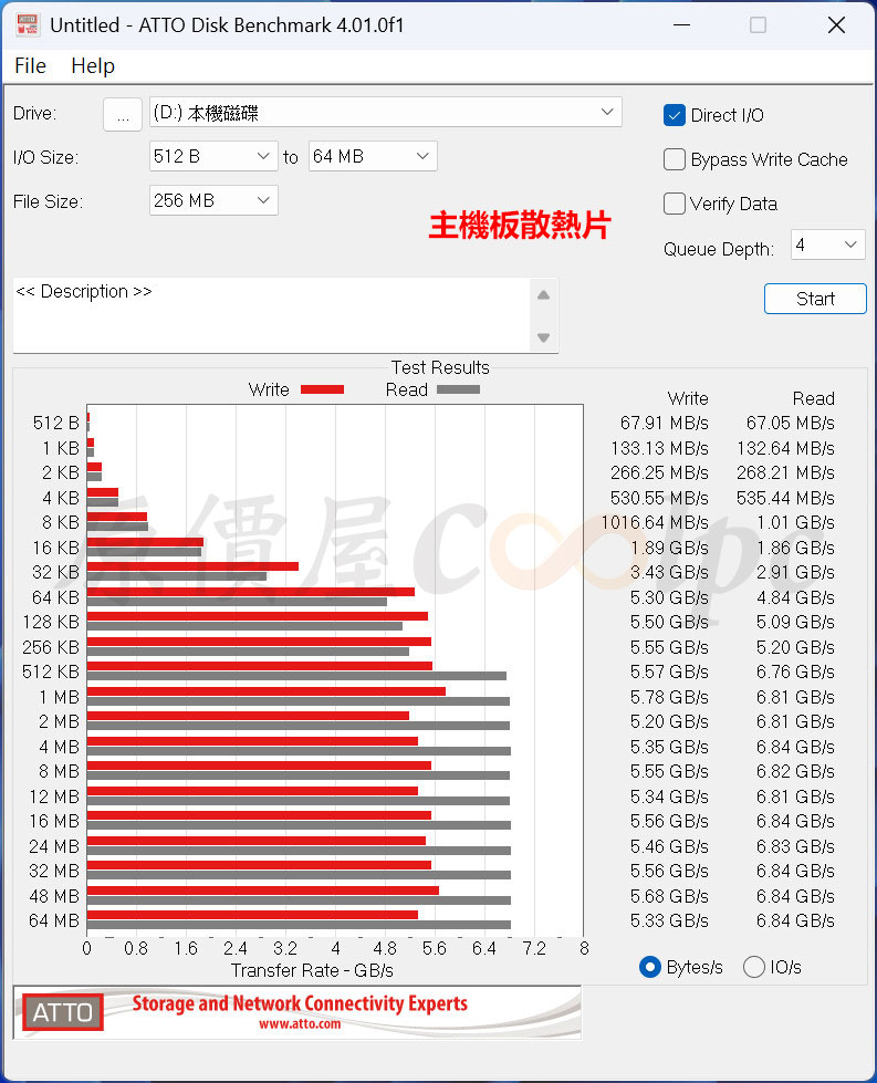 ATTO Disk Benchmark 有散熱片測試結果,寫入數據比沒散熱片的還要好一些。
