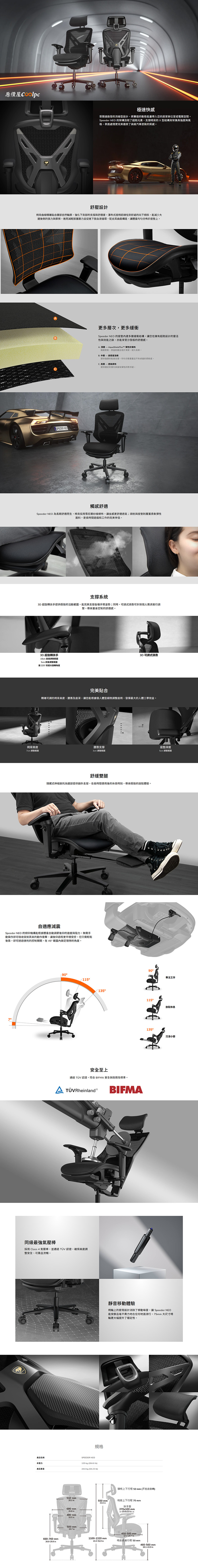 今天促銷的COUGAR SPEEDER NEO更是進一步升級,新增多層緩衝結構座墊,由頂層AquaShieldTex™ 彈性針織布、中層高密度泡棉、底層透氣網布組成,頭枕也由網布改為柔軟彈性面料。其餘則大多延續SPEEDER的優異性能,採用高品質雪尼爾紗線網布,保持通風透氣涼爽,背後的X型結構背架也保留下來,搭配符合人體工學輪廓的椅身,瀑布式紓壓座椅,椅背高度、腰靠支撐、坐墊深度都能調整,並搭載自適應減震機構,自動根據乘坐者體重調整椅背後仰速度與阻力,最大後仰角度135°,且頭靠與扶手都是3D設計,扶手還能225°超大旋轉角度。而特別的伸縮腳托也沒少,將舒適度從頭延伸到腳。最後再配上通過德國TÜV 認證的CLASS 4氣壓棒,75mm大尺寸靜音椅輪,承重達到120KG,更符合美國BIFMA安全與耐用標準認證!