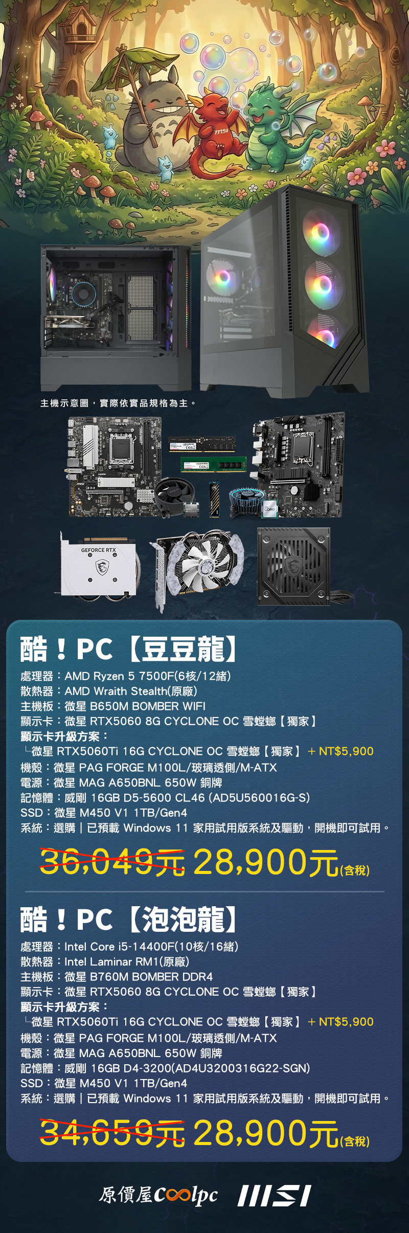 NT$5,900 升級 RTX 5060 Ti 16G,合計限量 300 套!這陣子光看到記憶體與 SSD 的價格就縮了,但現實是…遊戲要玩、案子要做,最終電腦還是得組。原價屋這次直接找上 NVIDIA、AMD、Intel、MSI 各大廠談個痛快!我們決定竭盡所能為各位玩家守住這塊最後的性價比淨土,正式推出酷!PC【豆豆龍】與【泡泡龍】特仕主機。整套最高折價超過 NT$7,000