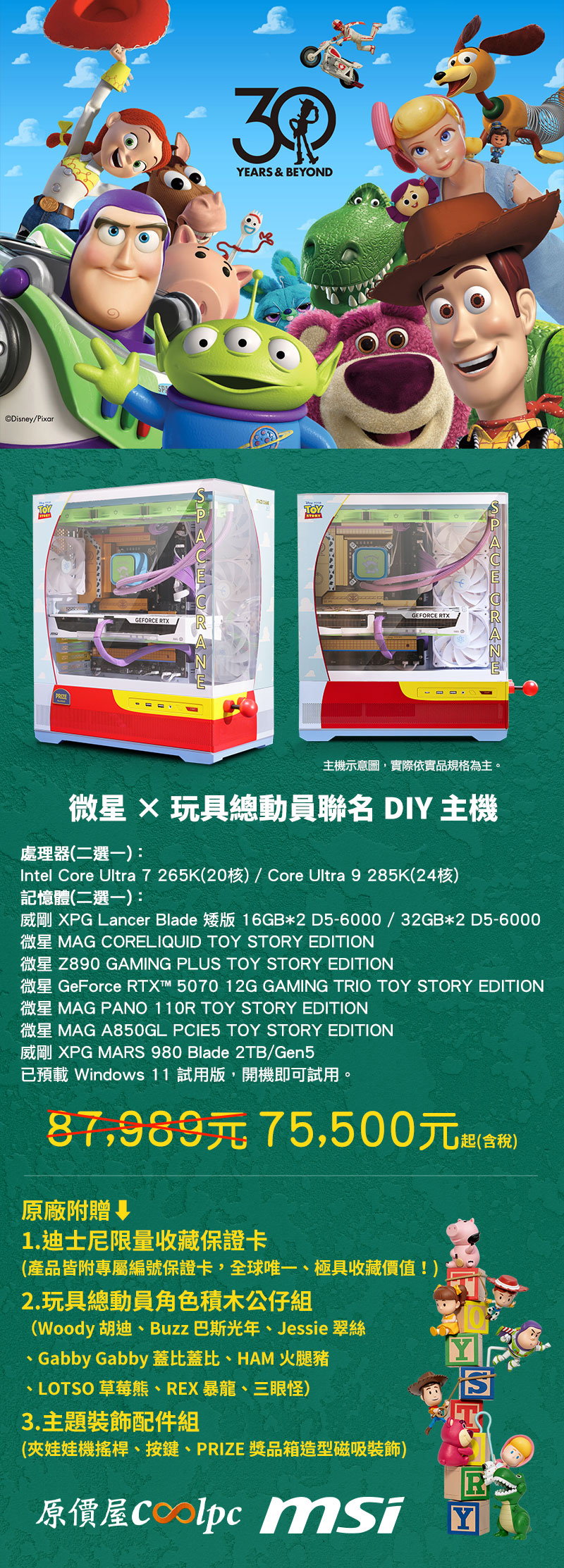 既然是套 DIY PC,仍保有自由搭配的選擇權,CPU 提供 Intel Core Ultra 7 265K(20核) / Core Ultra 9 285K (24核),記憶體提供威剛 XPG Lancer Blade 矮版 16GB*2 DDR5-6000 / 32GB*2 DDR5-6000,同時確保最低延遲,我們堅持使用 XPG MARS 980 Blade 2TB Gen5 等級 SSD,不論遊戲載入、AI 模型訓練、影音剪輯各領域都能取得最大優勢!而優惠方面更是展現最大誠意,除了原廠預附的迪士尼限量收藏保證卡、玩具總動員積木公仔組、主題裝飾配件組之外,【微星 × 玩具總動員聯名 DIY 主機】總價現折萬元以上!這套全球限量款已在原價屋蝦皮商城上架,記得雙 12 領券最高再折 NT$4000(詳情),喜歡玩具總動員的朋友千萬別錯過啦!